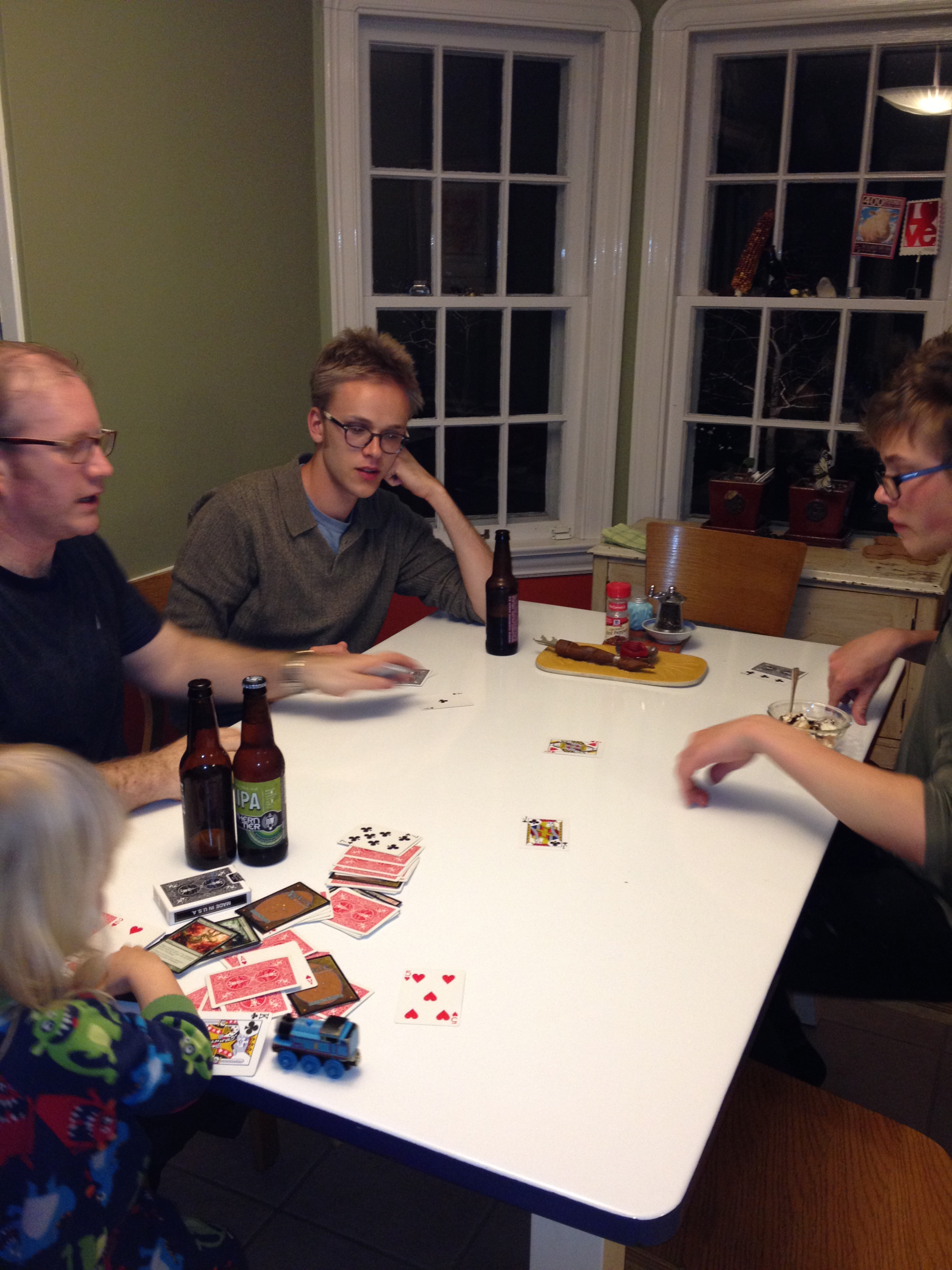 IMG_1583The removal of television from our home nearly twenty years ago now seems like a quaint notion, like closing a window on a capsizing boat to keep the water out. We had no idea of the technology that was coming, but getting rid of the television was absolutely the right thing to do. Regardless that four of us now have iPhones, that Claude and Hugo both have laptops of their own, we still keep the screen time pretty low. Line up my kids and ask them how they would most like to spend an evening at home with the family and I’ll give you 8 to 1 odds that they’ll pick sitting around playing cards or board games. Every time.