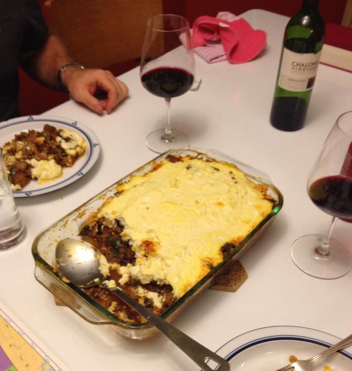 1381701_10151933155944309_1199122032_nBut it is no longer high season for all the ingredients in ratatouille and, after eating it from mid-August to late September; my diners were ready to go forego it for another eleven months. So what to do with an unexpected surfeit of these dark vegetable beauties? Moussaka. I thought I had a recipe I had printed out from the Internet some years ago, but I couldn’t find it. Though I often pore over my collection of cookbooks, which I weeded down to two shelves of my essential favorites when we moved, I researched the moussaka online. I love comparing recipes and the Internet has made doing so easy fun. I Googled “easy moussaka,” because the last time Max followed an authentic recipe for the dish from one of our cookbooks, it took him three hours to put it together. It was fantastic, but I wanted a recipe that could be called “Working Mom’s Moussaka” (which describes all moms, but “All Mom’s Moussaka” doesn’t make the same, or any, point).