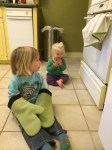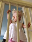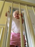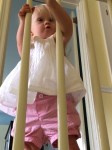 • She plays with toys, but more often disappears in the house and takes everything out of any cupboard, dresser drawer or laundry basket she finds within her reach that has been left unsecured. “I see it has been raining baby clothes,” Max says after Lyra has shoved, yet again, several of her shirts or Leif’s pants through the railings of the balustrade on the second floor of our home. Clean clothes purloined from the dressers in the adjacent bedrooms only to be flung onto carpeting coated in cat hair. Thanks, kids.