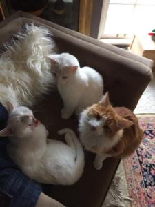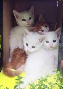 I drove over with Jules and Leif. Sure enough, when we pulled in the driveway, there they were: three white kittens and an orange one frolicking in the front yard. As soon as they saw us, they darted back under the porch.