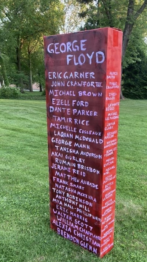 Public art protest installation by Jules Christensen listing the last 100 victims killed by police in America.