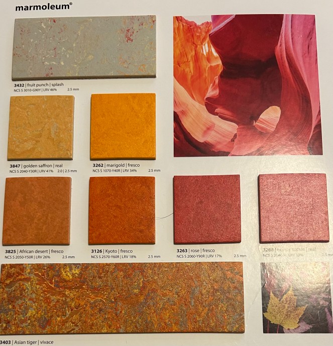 I love linoleum that unapologetically looks like linoleum. Akron’s First Flooring & Tile can order Marmoleum by Forbo, which is old-school vegetable linoleum. The patterns are beautiful, the material is both environmental and durable, while also gentle on the legs. In 10 minutes I chose Asian Tiger, an orange swirl with reds and grays that, yes, would be a perfect floor for children to play hot lava.
