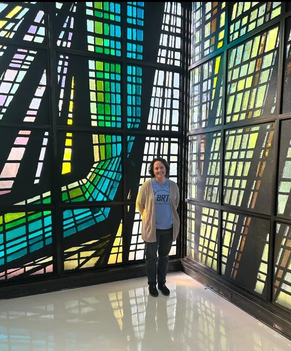 Principal Michele Angelo in front of one of several stained glass walls in Bridges Learning Center.
