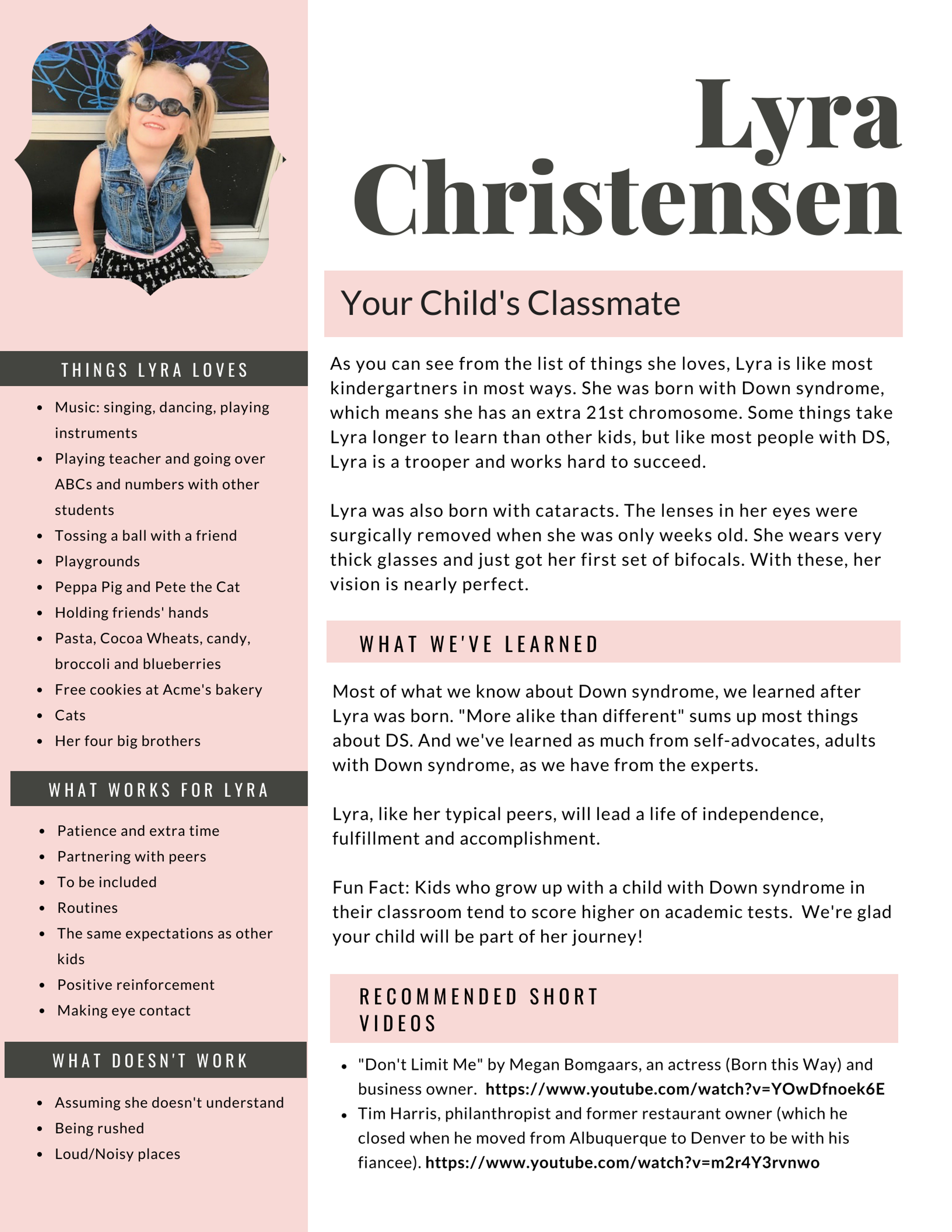 Also important to all people living with any diagnosis is people-first language. Lyra is not a Down syndrome girl, she’s a 6-year-old girl, a kindergartner, a sister to her four brothers, and a lover of music, books, playgrounds and cats. The British cartoon “Peppa Pig” is Lyra’s favorite show, from which she’s learned to pronounce several words in the Queen’s English including “luh-vley” for “lovely.”