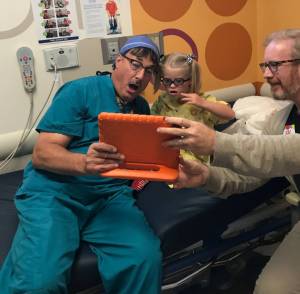 Ophthalmologist Dr. Richard Hertle, Lyra and dad Max Thomas before Lyra’s procedure on Thursday, July 26, 2018. (Photo: Holly Christensen)